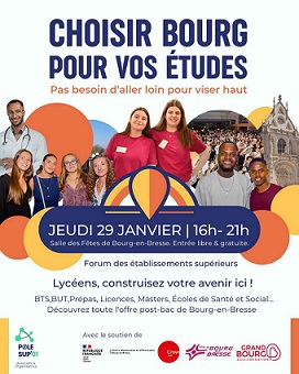 Pôle Sup 01 organise un Forum des Formations de l’Enseignement Supérieur dans l’Ain le jeudi 29 janvier 2026 de 16 h à 21 h, à la Salle des Fêtes de Bourg-en-Bresse (parkings à proximité).