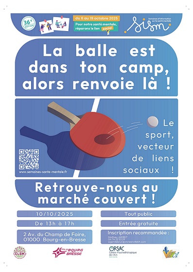 Dans le cadre des semaines d’information sur la santé mentale (SISM) du 6 au 19 octobre 2025, le CIO de Bourg en Bresse propose un atelier, dans ses locaux, au 34 avenue Général Delestraint à Bourg en Bresse le mercredi 15 octobre 2025 avec une Psychologue de l’Éducation Nationale.